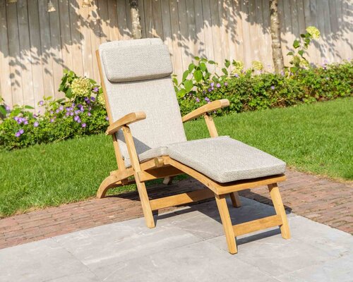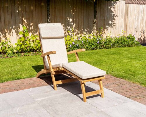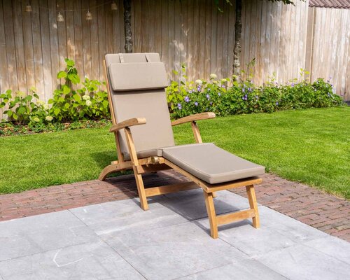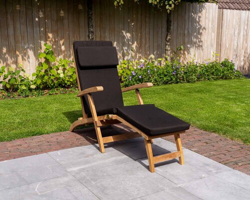 Der Teakholz Liegestuhl New Ocean hat eine verstellbare Rückenlehne und einen festen Fußhocker. Der Liegestuhl von Puurteak hat eine bequeme Sitzfläche und ist komplett klappbar. Das moderne Design spricht für sich selbst. Da die Rückenlehne und die Sitzfläche des Teak-Liegestuhls relativ geschlossen sind, kann man auch ohne Kissen bequem sitzen. Der Liegestuhl ist ein idealer Liegestuhl zum Entspannen. Die feste Ottomane an diesem Teakholz-Liegestuhl bietet Ihnen noch mehr Sitzkomfort. Das hochwertige Material und das schöne Design machen diesen Teak-Liegestuhl zu einem echten Hingucker in Ihrem Garten! Zu dieser Teakholzliege sind auch Gartenpolster in den Farben Schwarz, Grau und Sand erhältlich.